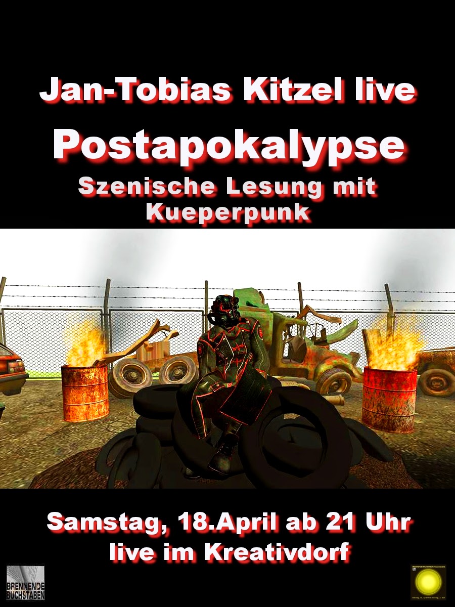 Ebenfalls am Samstag, den 18. April ab 21 Uhr empfängt uns Jan-Tobias Kitzel in seiner selbst gebauten postapokalyptischen Zone im Kreativdorf. Dort wird er gemeinsam mit mir szenisch lesen.