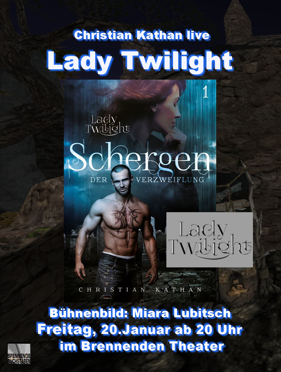 Am Freitag, den 20. Januar wird Christian Kathan ab 20 Uhr für Euch aus dem ersten Roman seiner "Lady Twilight" Saga lesen. Das Genre ist Pranormal Romance. Ich bin sicher, nach Christians Auftritt werden wir seine Heldin gut kennnen. Die Lesung wird die erste im Brennenden Theater sein. Wo das sein soll? Natürlich im Kreativdorf! Gebaut hat es Miara Lubitsch als Treffpunkt, Ausstellungsort und Bühne für alle Kreativdorfbewohner. Wir sind schwer begeistert und freuen uns darauf, Leben in die Bude zu bringen.